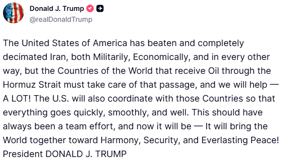 “Shtetet e Bashkuara të Amerikës e kanë mundur dhe e kanë shkatërruar plotësisht Iranin, si ushtarakisht, ekonomikisht dhe në çdo mënyrë tjetër, por vendet e botës që marrin naftë përmes Ngushticës së Hormuzit duhet të kujdesen për atë kalim, dhe ne do të ndihmojmë – shumë! SHBA-të gjithashtu do të koordinohen me ato vende në mënyrë që gjithçka të shkojë shpejt, pa probleme dhe mirë. Kjo duhet të kishte qenë gjithmonë një përpjekje ekipore, dhe tani do të jetë – Do ta bashkojë botën drejt Harmonisë, Sigurisë dhe Paqes së Përjetshme! Presidenti Donald J. Trump”, shkruan Trump./abcnews.al